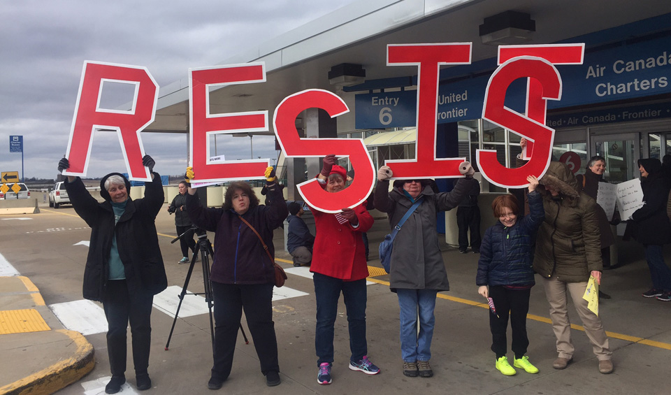 Holding signs that read, “human beings are not illegal,” and chanting, “hey-hey, ho-ho, Donald Trump has got to go!” protestors filled and blocked all six entrances at the airport’s main terminal.