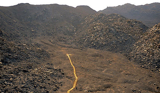 Photo: Granite Mountain fire shelter deployment site. Dozer line can be seen in contrast to the surrounding burned area. This dozer line was put in to retrieve the Granite Mountain Hotshots – this was not created during suppression efforts. Deployment site can be seen as slightly discolored area just beyond the end of the dozer line. Granite Mountain Hotshots Memorial Facebook page.