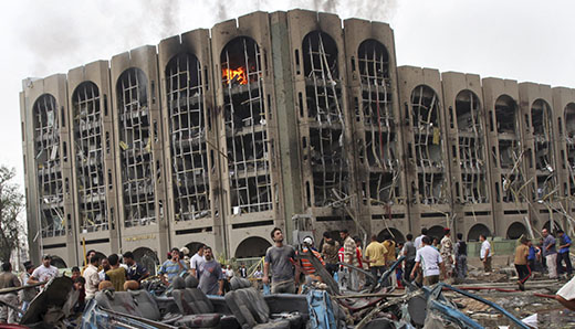 The enormous blasts targeted three government buildings – the Justice Ministry, the Ministry of Public Works, and the Baghdad provincial council, where 10 members of Parliament were attending a meeting. All three buildings were destroyed. The bombings, the deadliest in two years, took place along a road filled with traffic and set more than 150 vehicles on fire, incinerating entire families.