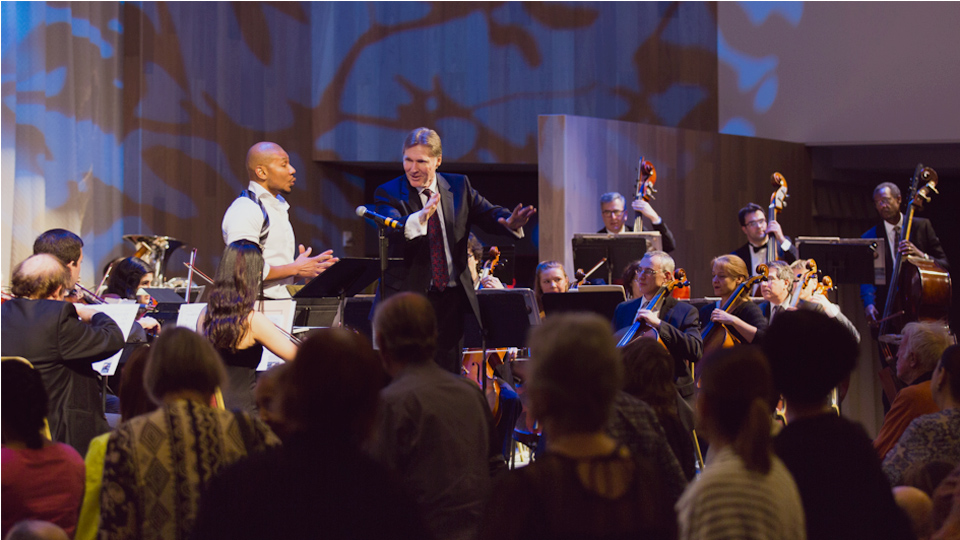 Before the intermission, bass-baritone soloist Cedric Berry came to the stage to perform an aria by Giacomo Puccini, the first-act “Te Deum” scene from the opera Tosca. Why on a MLK concert? one might ask. Well, he had been engaged as the narrator for the concluding work in the second half, but Lamell wanted to give Berry a chance to display his singing voice, and this is the aria Berry chose.