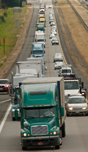 Photo: Tractor-trailers head north along Interstate 5 north of Albany, Oregon. Oregon Department of Transportation inspections found that 26 percent of truck drivers spent too much time on the road or too little time at rest. Timothy J. Gonzalez /Statesman-Journal/AP