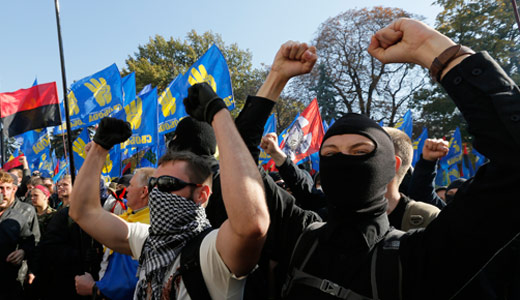 Photo: Demonstrators led by the fascist Svoboda Party and the equally extremist Right Sector, Pravy Sektor, protest outside the parliament in Kiev, Oct. 14, for recognition of the Ukrainian Insurgent Army (UPA), which fought during World War II, mostly on the German side, to be recognized as a patriotic force. (AP Photo/Sergei Chuzavkov)