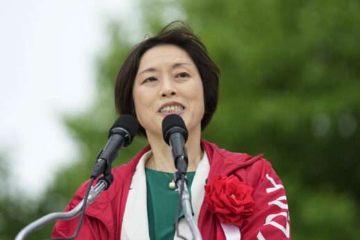 Tomoko Tamura, chairperson of the Japanese Communist Party, speaks during a May Day rally in Tokyo, May 1, 2024. Eighty years after the defeat of Japanese imperialism, she warns that the government is following the U.S. toward war. | Hiro Komae / AP