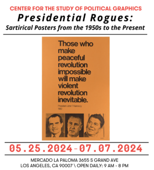 LOS ANGELES — Here we are mid-2024 and nothing is more welcome in this tense election year than a bit of humor and irreverence. Center for the Study of Political Graphics’ exhibition Presidential Rogue’s Gallery: Satirical Posters from the 1950s to the Present serves that up well, and you can view it now at Mercado La Paloma in Los Angeles or from the comfort of your own home on Mercado’s website. We recommend viewing the exhibition in person so you can also enjoy the site itself, the people watching, the superb food, and the outdoor entertainment at Mercado—but more of that later.