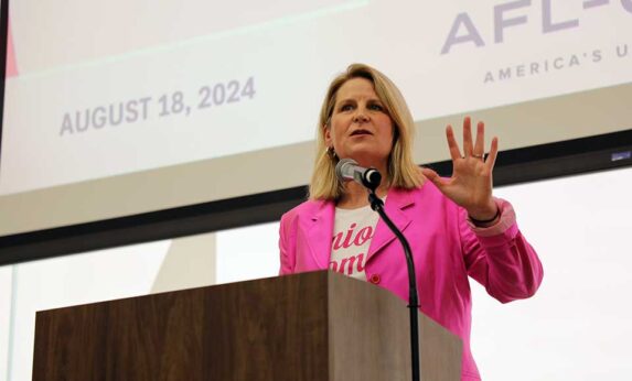 The session turned into a celebration of powerful women, including Shuler, Gov. Maura Healey, D-Mass., Wisconsin AFL-CIO Secretary-Treasurer Stephanie Bloomingdale, and new Service Employees President April Verrett—and the labor movement’s strong support of Democratic Vice President Harris’s nomination for the presidency.