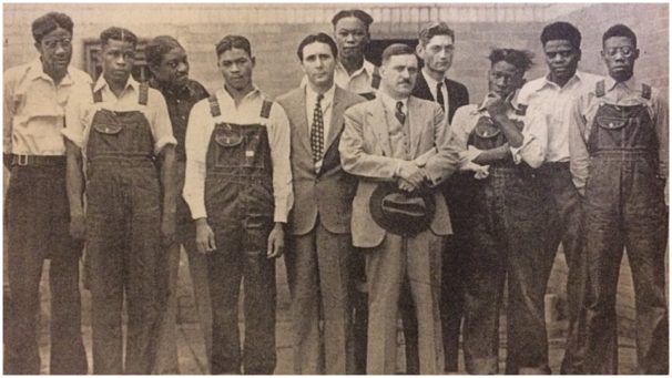 The Scottsboro Nine with then-General Secretary of the Communist Party USA Earl Browder (holding hat) and other unnamed visitors. | People’s World Archives