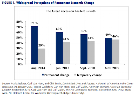 The poll demonstrates the increasing loss of hope by American workers that more positive pre-Reagan trends in wages and incomes will return. It will take numerous years, at full employment, to even repair the enormous damage of this depression — estimated by Jared Bernstein to be an average annual $7500 per household.