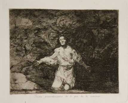 In Plate 1, “Tristes presentimientos de lo que había de acontecer” (Dark Forebodings) from Los Desastres de la Guerra, shadowy, chaotic, monstrous forms emerge in the dark clouds of the background. The sky is filled with a swirling turmoil, an intimation of profound terror—bat-like or demonic figures reminiscent of the artist’s Los Caprichos. The dark, blurred tonality created by aquatint evokes an advancing black fog threatening to engulf the central kneeling figure. The turbulent sky seems to foreshadow the atrocities depicted later: a nightmare vision that renders visible the psychological fear, anxiety, and the sense of impending doom hanging over the Spanish people. The kneeling, barely clothed figure in the foreground lifts its gaze toward the sky, as if imploring the threatening forces above. Like Christ kneeling in the Garden of Gethsemane asking that the cup pass from him, it embodies the fear of death and the deeply human desire to escape the approaching horror.