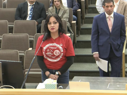 La camarera de cócteles del Virgin Hotel, Maria Saghin, testifica ante los comisionados del condado de Clark. | Foto vía Unite Here