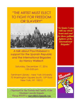 NEW YORK — The life of Paul Robeson was extraordinary; his journey of struggle and steadfast commitment to democracy and the working class was recalled by Nancy Wallach — the daughter of a Veteran of the Abraham Lincoln Brigade — in a riveting talk on the connection between Robeson and the Lincoln Brigade, given December 17 at New York University’s Tamiment Library.