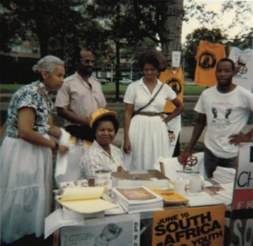 But as busy as her job and union activity kept her, she also found time to lead another critically important struggle with an international focus. She organized and chaired the Friends of SOMAFCO, a group that for many years provided crucial support in the form of books and materials to a school for young people forced into exile from their homeland in apartheid South Africa.