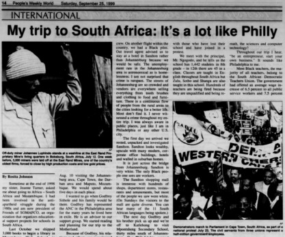 After her 1999 trip, Rosita wrote a comprehensive report which was serialized in a three-part series in the print edition of what was then the People’s Weekly World. In that report, she frankly told about the great efforts the people were making to bring change and move the country forward as well as the enormous problems South Africans faced after decades of the apartheid system.