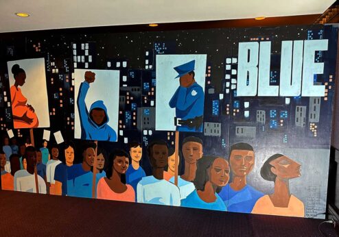 As part of its community outreach, NOO organized a mural for Blue created by 10th and 11th-grade art students taught by Roan Smith, studying the plot and characters of the opera, as well as the art of Harlem Renaissance artist Charles Alston. They adapted Alston’s paintings “Walking” and “Cityscapes of Harlem,” and came up with a design featuring peaceful protest, titling the mural “Shades of Blue,” on view at the opera.