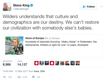 On March 12, U.S. Representative Steve King of Iowa (R) retweeted a political cartoon championing Dutch politician Geert Wilders. “Wilders understands that culture and demographics are our destiny,” tweeted King. “We can’t restore our civilization with somebody else’s babies.”
