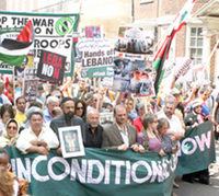 LONDON — On only a week’s notice, over 100,000 people took to the streets here Aug. 5 to demand an immediate cease-fire in Lebanon. Having assembled at Hyde Park’s Speakers’ Corner under the midday sun, the colorful protesters, holding placards saying “End Israeli crimes in Lebanon,” marched down Park Lane waving Lebanese flags and chanting … Continue reading 100,000 rally for peace in London