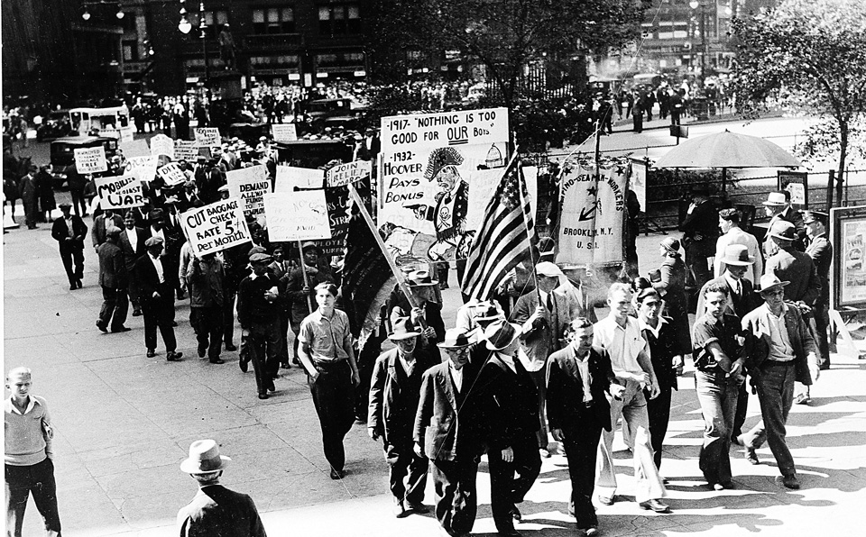 When the Great Depression hit in 1929, there was no welfare and no unemployment compensation. Many, many millions lost their jobs. People began to die from hunger. Although unions were at a low, the unemployed organized. One million people marched against hunger on March 6, 1930, led by the Communist Party and the Unemployed Councils. They won welfare, saving many from dying from starvation.