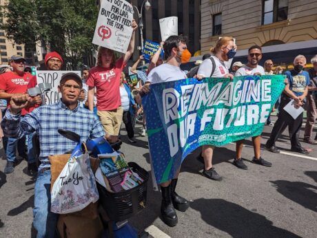 Sims informó que activistas laborales, grupos de igualdad racial y justicia de inmigrantes, organizaciones de mujeres y otros se alinearon a lo largo de Broadway y, mientras marchaban, instaron a los líderes de las Naciones Unidas a actuar ahora contra el calentamiento global.