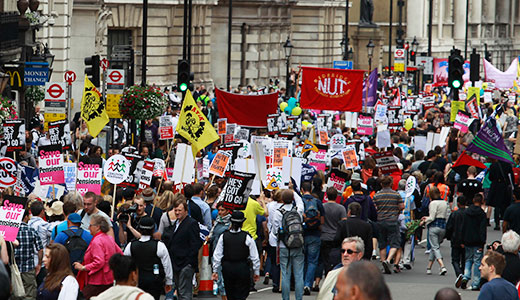 Photo: British teachers and public service workers clogged the streets of London, Thursday, July 30, as hundreds of thousands walked off the job around the country to protest pension cuts. (AP/Lefteris Pitarakis)