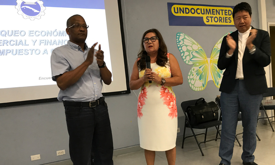 Cristina Vásquez, longtime L.A. labor and political activist, introduced the speaker, briefly recalling how much history has transpired since she first tried to get a Cuban labor leader to L.A. to speak—the fight to free the Cuban Five, the efforts to end the U.S. blockade, and now Trump.