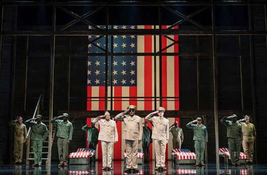 The staging is rich with African-American patois, vigorous, uninhibited physicality and gesture, Delta blues, rhythmic choral song deriving from work crews and/or prison gangs, and Black fraternity step dance that introduces sly choreographic blue notes to satirize strict military march discipline. The entire production (set design by Derek McLane, costumes by Dede Ayite, lighting by Allen Lee Hughes, sound by Dan Moses Schreier) is a joyous barracks spectacle that gives full honors to a modern classic of the American stage.