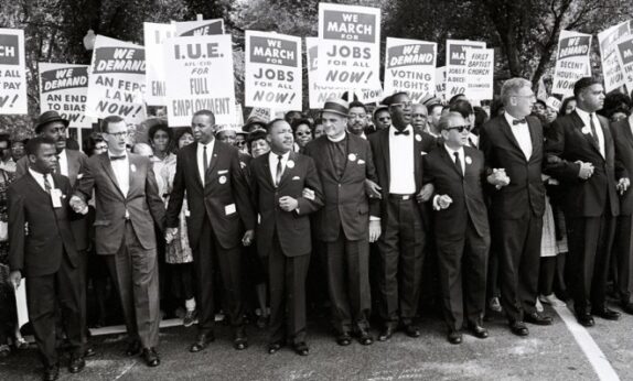 The 1963 March for Jobs and Freedom in Washington, led by Rev. Martin Luther King, Jr., seen at center of this group of faith and labor leaders.