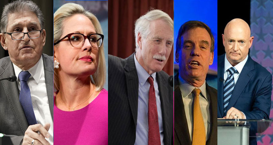 The five Democratic holdouts are Sens. Mark Kelly and Kyrsten Sinema, both from Arizona, Mark Warner from Virginia, Joe Manchin from West Virginia, and Angus King, the Independent from Maine who caucuses with the Democrats.