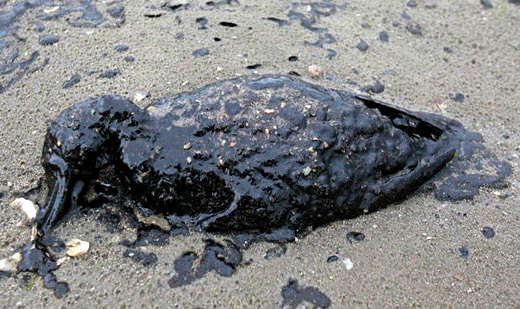 Photo: An oil-drenched bird, just one more victim of the oil disasters in Texas City, lies dead on the eastern shore of Galveston Bay. AP