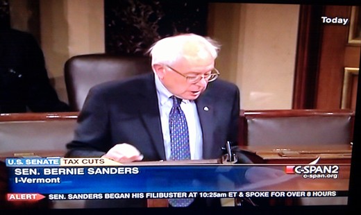 Tens of thousands signed a “No Deal” petition supporting Vermont Sen. Bernie Sanders’ eight hour filibuster against the tax cut package negotiated by the Republicans and the White House. The Senate video server crashed temporarily as millions watched his angry diatribe against the deal and his Twitter page was swamped with 4,000 new followers.