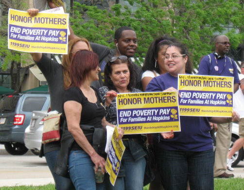 Contract negotiations between the union and Hopkins have been focused on maintaining benefits and working conditions won in years past, and elevating the minimum wage rate at Hopkins to $15 per hour. The current minimum is barely higher than the new Maryland minimum wage rate passed by the General Assembly, raising the wages to $10.10 per hour over the next four years. There are many examples of employees losing what they have in this difficult economy because they can’t sustain their family on Hopkins pay. Hopkins in the meantime just completed construction of an entire new hospital facility, opened in 2012, at a cost of just over a billion dollars.
