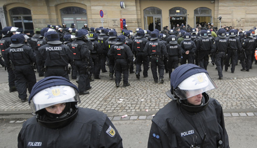 Photo: Police officers blocking the entrance to the the train station in Dresden, Feb. 19. Pawel Sosnowski / AP