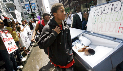 Photo: Wesley Keith, 8, right, pretends he is dead in a coffin carried by Lamar Robinson, 16, center, and other members of the Greater Roseland Community Committee Youth Voices Against Violence group during the Day of Action Rally in Chicago, June 18, 2009. Lane Christiansen/Chicago Tribune/AP