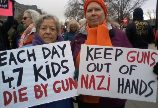 Kris Gregory, a grey-haired gun violence prevention activist from the D.C. suburb of Falls Church, Va., carried a sign proclaiming “Keep guns out of Nazi hands.” She said it’s a direct reference to the gun-wielding Nazis and their riot over keeping a Confederate statue in Charlottesville, Va., in 2017. While many of those Nazis toted weapons, one plowed his car into a crowd of counter-protesters there, killing Heather Heyer and injuring at least 19 more.