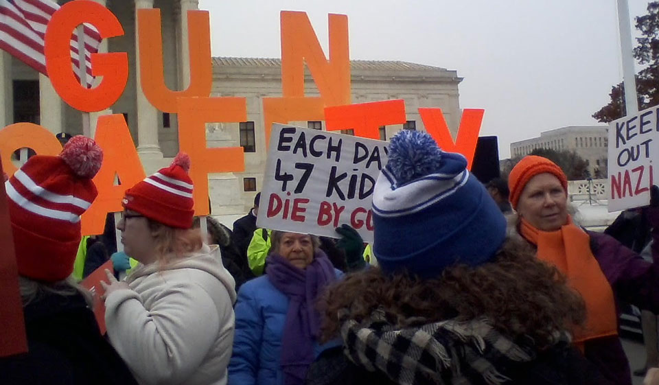 Demonstrators massed on the sidewalk in front of the court to make clear the U.S. wants tighter gun regulation and not – as the NRA demands – none at all.