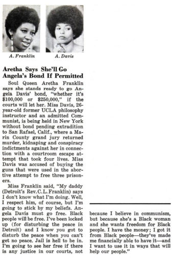 Franklin is quoted as saying, “…Angela Davis must go free. Black people will be free. I’ve been locked up (for disturbing the peace in Detroit) and I know you got to disturb the peace when you can’t get no peace. Jail is hell to be in. I’m going to see her free if there is any justice in our courts, not because I believe in communism, but because she’s a Black woman and she wants freedom for Black people. I have the money; I got it from Black people—they’ve made me financially able to have it—and I want to use it in ways that will help our people.”