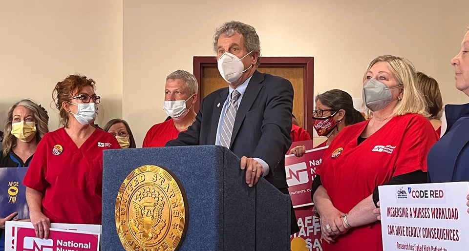 “Nurses are leaving hospitals because the staffing and the working conditions are terrible,” Eric Cromer, RN, told Brown’s Ohio press conference. “The truth is that nurses are exhausted. New nurses leave the profession within a couple of years and older nurses are retiring early. We need to make the profession something people want to be a part of, where it’s not going to cost you your mental health, or physical health, or force you to risk your license. We need safe staffing ratios.”