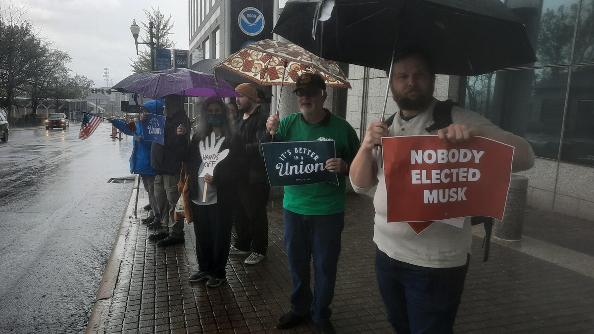 ASHEVILLE N. C.— “Rain or shine, hold the line!” rang out against the sleet and rain outside of the Federal Building on April 11. Local unions held a rally demanding an end to the attacks on unions and federal workers by the Trump administration and Elon Musk.