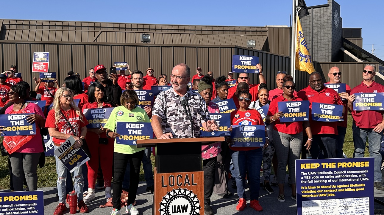 They responded by shouting “Strike! Strike! Strike!” and wearing stickers that read “Vote YES To Strike Stellantis.”