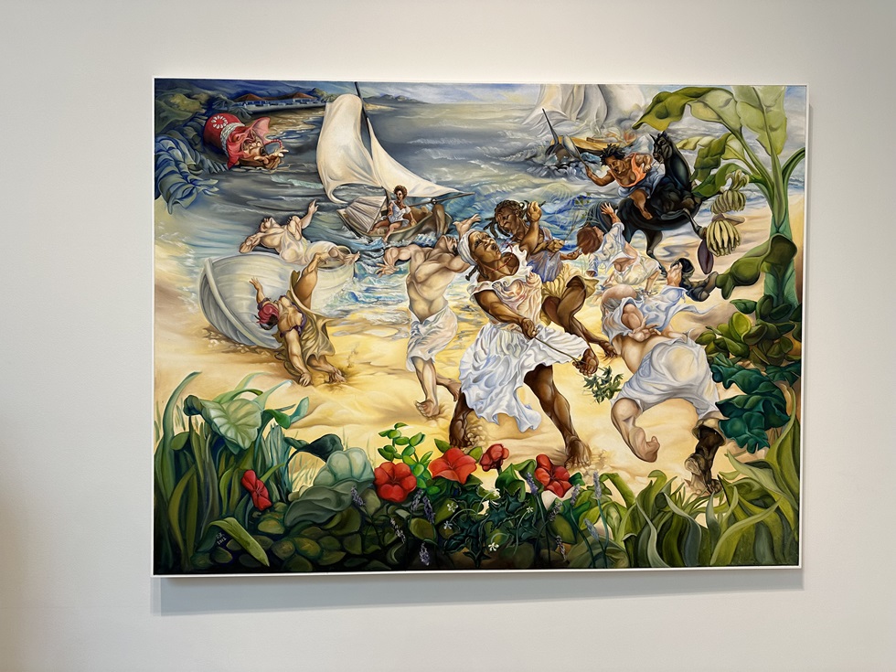 Just to mention a few highlights that stood out on a recent visit, Rik Freeman’s monumental oil painting A Liberdade de Maria Felipa, dating from 2012, is based on the local Bahian narrative of Maria Felipa de Oliveira, an enslaved woman who in 1823 led a group of forty women in a revolt against the Portuguese Navy on Itaparica Island. Freeman recalls this episode: “These women lured the sailors in using their feminine wiles, and when the boys got a little hot ’n’ bothered…the women took out a cansanção bush, which has a multitude of needles that break off into the skin, and immediately infect it. Without mercy nor care, they beat these sailors into submission, then proceeded into the bay and set afire numerous ships.” The Portuguese were then forced to abandon the Island of Itaparica and return to Salvador.