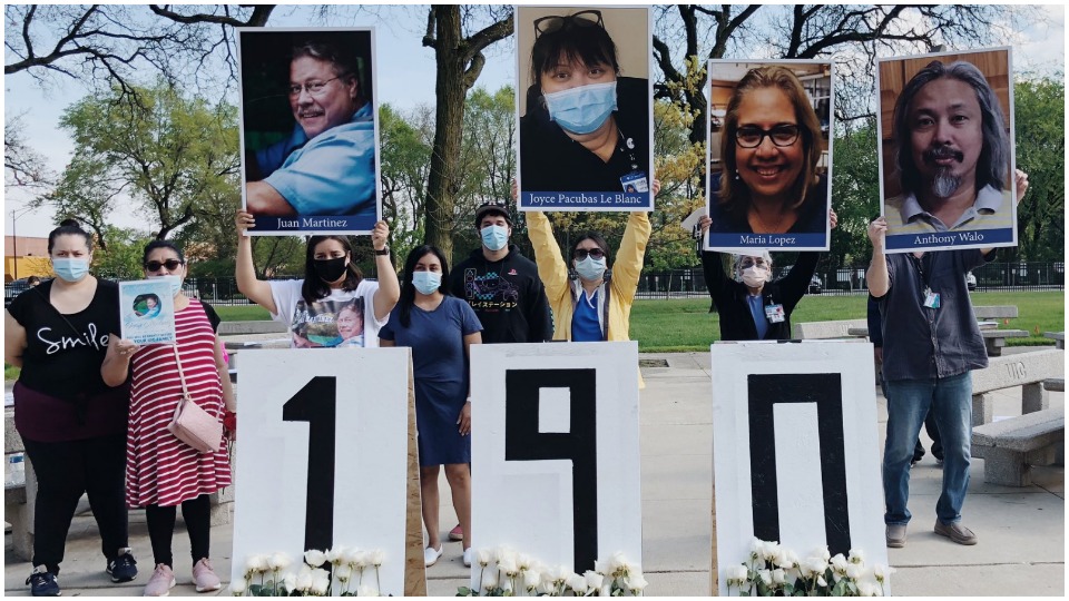 Called together by their unions, the Illinois Nurses Association and SEIU Local 73, hospital staff and families carefully distanced themselves last Friday at noon while demanding proper equipment and hazard pay.