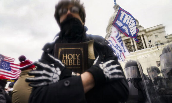 A man holds a Bible as Trump supporters gather outside the Capitol in Washington. The Christian imagery and rhetoric on view during this month’s Capitol insurrection are sparking renewed debate about the societal effects of melding Christian faith with an exclusionary breed of nationalism. | John Minchillo/AP