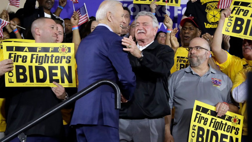 WASHINGTON—Last winter, Joe Biden stood and smiled behind an International Association of Fire Fighters podium as more than 800 Fire Fighters stood, cheered, and waved yellow-and-black signs that declared “Run, Joe, Run” for the White House.
