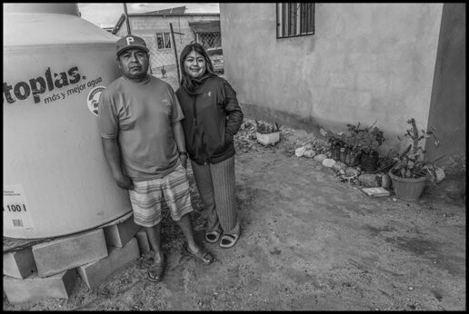 Farmworkers and other residents in an informal settlement, or colonia, in the San Quintin Valley.. Luis and Joanne stand in front of the garrafon where they store the water they have to buy once a week, for 120 pesos.| David Bacon