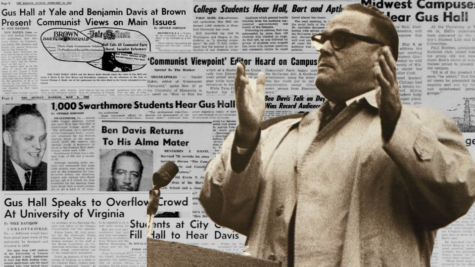 To Hall, a shift in consciousness was taking place. The “fascist-like assault” designed to “transform the American people into a hysterical anti-Communist mob” had failed. Senator Joseph McCarthy had been silenced. The Smith and McCarran Acts would both be declared unconstitutional. Communists were now on the offensive, regularly speaking to thousands of students across the country. The “squirming of politicians,” the “fanatical fascist-like fringe of the ultra-right” was being “pushed back into its lair,” Hall concluded. This was partly due to the courage of student activists who spearheaded the right of Communists to speak on college and university campuses across the country, a strategic relationship Hall would not soon forget and one that would become a prominent feature of the general secretary’s work for many years to come.