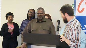 Photo: From left to right: Tony Pecinovsky, Lew Moye, Bernie Hayes, Zenobia Thompson and Mark Esters. By Aaron Burnett, St. Louis Jobs with Justice/PW