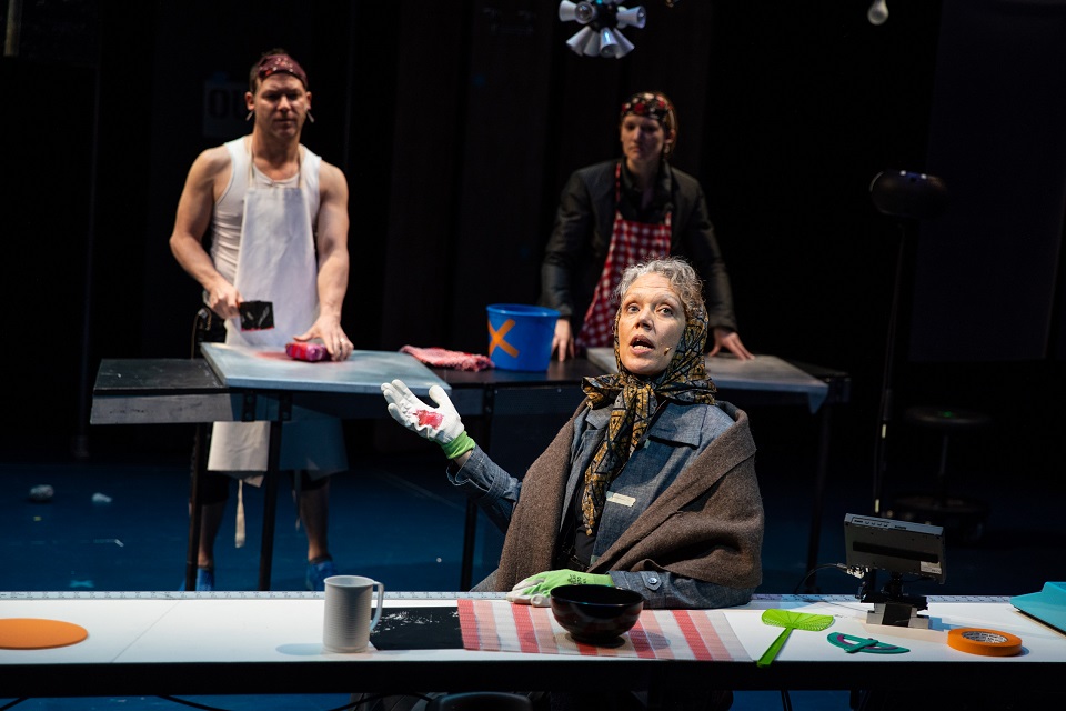 Of course, these onstage disruptions (Brecht’s famous “alienation effect” on display) serve the purpose of alerting the audience that this is a play, not real life, and unlike fourth-wall naturalistic theater, which viewers are encouraged to relate to emotionally, Brecht wanted his spectators to not only feel about the story and characters but more importantly, to think about them. But none of The Mother’s crafty stage techniques are remotely as inventive and unforgettable as when their Wooster Group forebears threw open their garage door and marched out into Manhattan’s mean streets to continue Mother Courage lo those many moons ago.