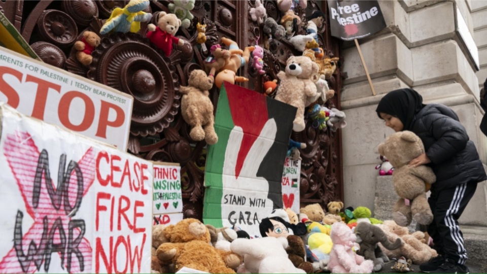 Each toy represented a Palestinian child killed by the Israeli bombardment, supported by the British government, Parents for Palestine said. Children pinned teddy bears and other toys to the gates of the government department in London, while the names of the 3,000 children killed in Gaza were read out.