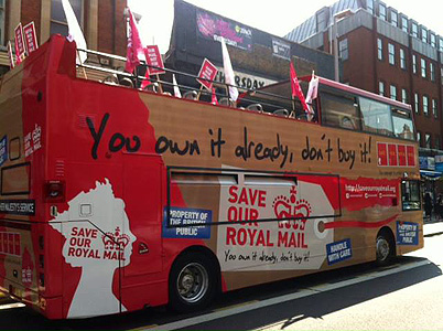 Instead, the bus is the latest way the 203,500-member Communications Workers Union declares its opposition to Conservative Prime Minister David Cameron’s scheme to privatize the United Kingdom’s postal service, the Royal Mail.