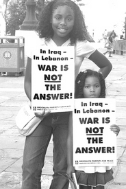 Following up on this theme was Carolyn Eisenberg, a co-founder and vice-chair of BPFP, who decried both the horrific destruction of Lebanon and Hezbollah’s missile attacks on Israeli cities, and connected these events with the ongoing occupation in Palestine, and U.S. policies that she described as ‘one-sided and obstructionist.’ She concluded by thanking the two Brooklyn congressional representatives, Major Owens and Nydia Velasquez, who have called for an immediate and unconditional cease-fire in support of the Kucinich bill in the House (HR 450). She questioned the silence of the remaining Brooklyn congressional delegation as well as the pro-war stances of Senators Schumer and Clinton. Eisenberg then exhorted the gathered crowd to take action, be it by ‘marching, writing and organizing to bring these policies to a halt.’