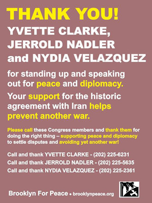 NEW YORK – In an important rebuff to the American Israel Public Affairs Committee and the forces of war, four key Brooklyn congresspeople, three of them African American and one Latina, representing large concentrations of Jewish voters, came out in support of the Iran deal. Early defense of President Obama’s diplomacy by the Congressional Black Caucus and Progressive Caucus played a role., as well as the work of House Minority Leader Nancy Pelosi’s office. But energetic organizing by grassroots peace organizations in Brooklyn also played an important part.