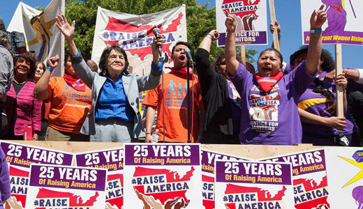 Photo: “We fight in our contract campaign to build on better wages and working conditions, to support the new minimum wage proposal and call for continued action to protect immigrant workers! We need stop the harassment, sexual assault, and the exploitation of immigrant women janitors! YA BASTA!” SEIU United Service Workers West, Facebook.